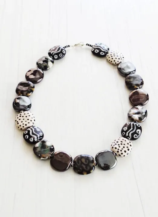 平たいビーズが肌に心地良く馴染むPITAPATネックレス。ダークカラーをメインに使ったシックな色合いに、職人たちがフリーハンドで描くエスニック柄が魅力。1点でコーディネートの印象を変えるChuuiおすすめアイテム。