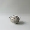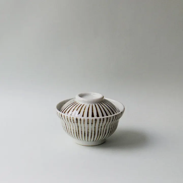 手のひらにすっぽり収まる小さな蓋付き豆どんぶり。 蓋付きのうつわは、江戸時代に身分の高い方のお料理に埃が入らないよう、また冷めにくいようにと使われていました。今の私たちの暮らしでも、ごはんのお供やお惣菜などを盛り付けただけで、ちょっと特別な気分を味わえます。 絵付けは全て職人による手仕事で、小さなどんぶりだからこそ熟練の筆づかいを感じられます。 ■山保製陶/土岐市駄知 瀬戸から駄知へ移り住んだ陶工・加藤家の流れを汲む老舗。6種類の土と、ろくろや鋳込みによる成形、手描き職人の技による柄を組み合わせて、味わいのあるうつわを作り続けています。