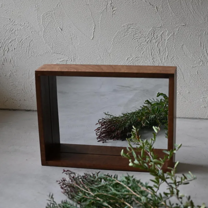 丈夫で趣きのあるマンゴーウッドをフレームにしたミラー。奥行きのあるフレームなので、雑貨や小さなグリーンを置いて、簡易的なドレッサーとしても活躍します。アクセサリーのディスプレイにもおススメです。