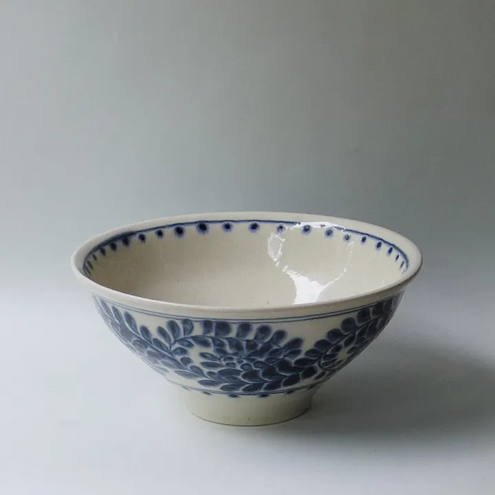 口元が少し反っているのでスープが飲みやすい形状の凛・麺丼。縁起の良い唐草文様は途切れることなく茎を伸ばしていくことから「繁栄・長寿」を意味します。職人による手描きの染付に、貫入釉(釉と素地の収縮率の差により、焼成後の冷却時に生じた釉のひび模様)を施すことで出るやわらかな風合いが特徴です。手描きならではの呉須の濃淡をお楽しみ下さい。 ■宗山窯 土岐市駄知。昭和26年創業。 「個性的な器造り」を理念に、温かみある生地に一点一点職人が描く大胆な絵柄が特徴の窯元です。実直な手仕事の温もりが伝わる器を作り続けています。