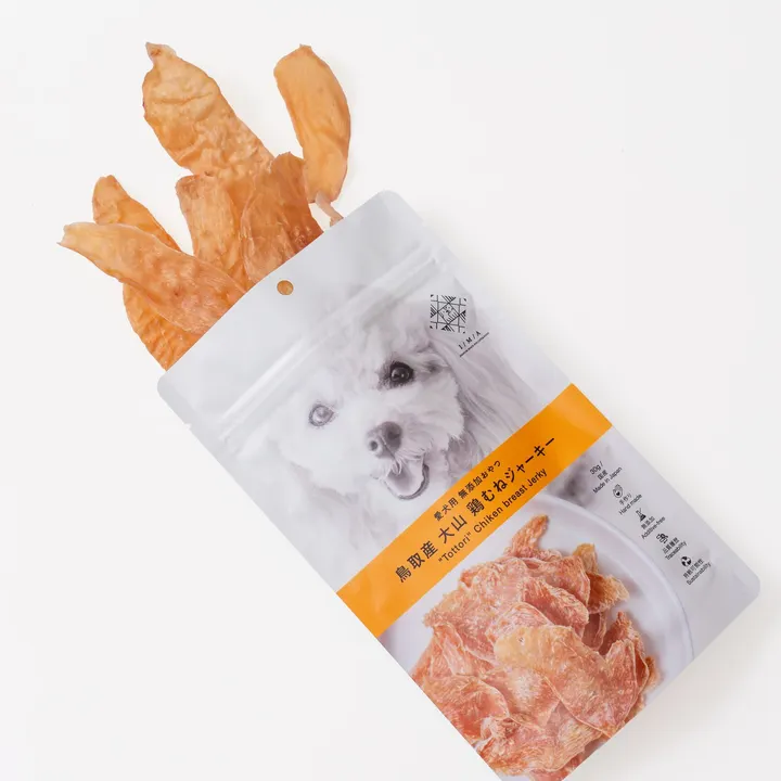 名峰大山の自然と天然水で育てられた健康で美味しい鶏を 100%使用し じっくり丁寧にジャーキーに仕上げました。 素材にも薄さにもこだわり、サクサクとした歯ごたえと 鶏の旨味が出て来るヘルシーなおやつです。 【Point①】ミネラル豊富な天然水で育てた健康で美しい鶏 鳥取県米子市の大山山麓の綺麗な地下天然水と新鮮な空気で大切に育てられた大山の鶏は 豊富な肉汁と柔らかい肉質が特徴です。 そのむね肉を丁寧に薄くスライスし、じっくり低温乾燥させ 旨味をぎゅっと閉じ込めた美味しいジャーキーに仕上げました。 【Point②】脂肪が少なくヘルシー 肉類の中でもアミノ酸がバランス良く含まれ、脂質・糖質を分解し エネルギーに変える効果のあるビタミンB群が豊富。 丁寧に皮を取り除き、ヘルシーに仕上げました。 高たんぱくで低脂質なので、愛犬のダイエットや健康管理に役立つ万能なおやつです。 【Point③】安心・おいしさへのこだわり 大山の鶏は徹底管理された専用飼料を食べ、平飼いにて長期間飼育されている為 安全でバランスのとれた肉質です。 愛犬のサイズに合わせた大きさに手で割りやすく パリッとした食感が楽しめるよう3~4mmの薄さにスライスしました。 原材料のみを乾燥で仕上げており、保存料・酸化防止剤・着色料などの添加物は一切使用しておりません。