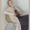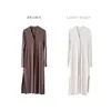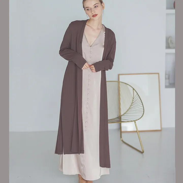 【デザイン・シルエット】 縦のシルエットを意識した長めの着丈がスタイリッシュに見せてくれます。 落ち感のある生地が縦ラインを強調し、スタイルが良くみえるような一着に仕上げました。 大判ビッグストールのような感覚で羽織れるあたたかなローブタイプのカーディガンです。 【素材・サイズ感】通気性に優れて上品な光沢感、シルクのような透明感のある滑らかな肌触りです。 軽さと柔らかさ、そしてサラリとしたドライな心地良さを兼ね備えています。 ドレープ性に優れており、シルエットが綺麗に見えます。