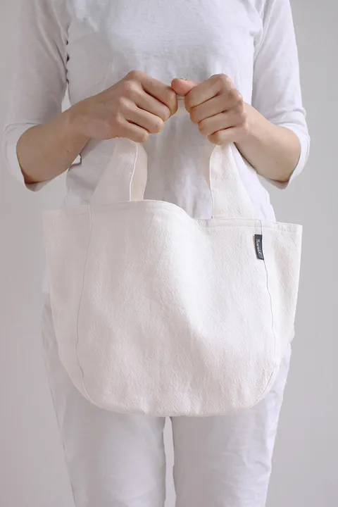 オリジナル生地「ウォッシュドコットン」で作ったバッグ。 丸いフォルムと幅広の持ち手がカジュアルで可愛らしい印象を与えます。 使い勝手の良いサイズ感で。