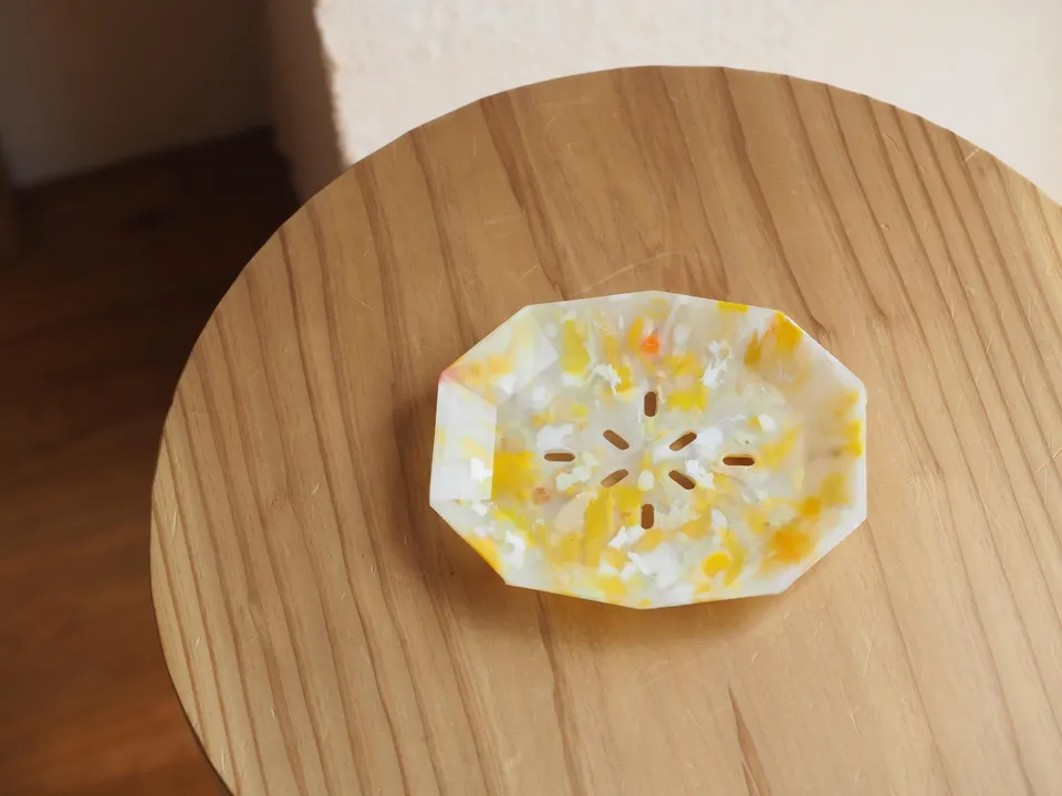 マーブル模様が特徴の海洋プラスチックごみを材料につくったプラスチック製のソープディッシュです。 ブランドbuoy(ブイ)は株式会社テクノラボというプラスチックメーカーが海岸に流れ着いてきた海洋プラスチックごみを材料として活用できるよう技術開発して生まれたブランドです。材料となる海洋プラスチックごみは日本各地のビーチクリーン団体様から買い取っており、製品には漂着地域が記載されています。 製品の色や模様は偶然集まったゴミに由来する為、製品ごとに色や模様が必ず異なります。 偶然うまれた世界に一つの模様をお楽しみください。 <仕様> サイズ 114.5×94.7×14.7mm <特徴> ☆製品のほぼ100%海洋プラスチックごみでできています。(製品をコーティングしているフィルムのみ海洋ごみでなはい) ☆製品に添付されている回収地域QRコードを読み込むと、その製品に使われた材料回収地域のページに飛び、回収者情報などを見ることができます。 同時発売の歯ブラシスタンドも同じ十角形で構成されており統一感があります。