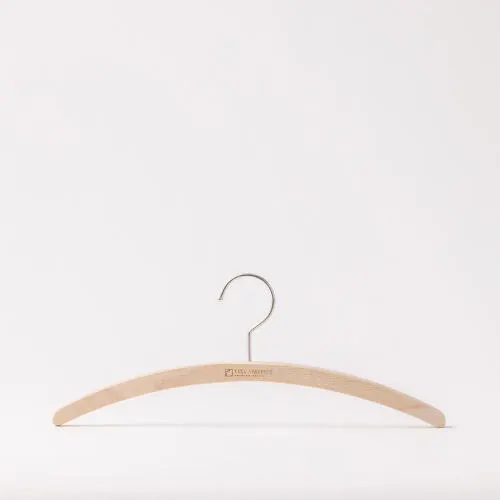 防虫・消臭効果のあるくすのきハンガー 【生産地】 日本 木部:くすのき 金具:スチール(クロムメッキ) 【サイズ】W380×D10mm 【重さ】 約65gシンプルな三日月の形をしたフラットハンガーです。薄手のシャツやカーディガンなども形を崩さず掛けられます。薄いのでクローゼットの中でもかさばりません。