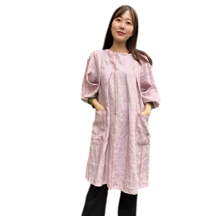 淡いピンク地にオレンジ・ホワイトのラインがやさしいリネン100% サーモンピンクのライン入りモスグリーンリブとの組み合わせ イングランドmerchant&millsの上質リネン 袖のリブはフランス製 季節を問わず働いてくれる一枚 かっぽー着としても ホームウエアとしても最適 作業がしやすいようにゆったりとした見ごろ 革紐をお付けしていますので ウエストを絞って着用 かぶりでうしろ紐結び かた結びにして うさぎの耳のようにしてもかわいい! ランタン袖の7分丈 フランス製リブ使いが効果的 ポケットは左右大き目サイズ ・革紐付き ・後ろ首から30㎝まで開き:ひも結び