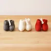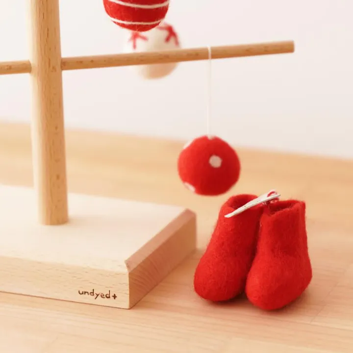 アンダイドプラスの定番人気商品のフェルトの小さなブーツ。 ひとつひとつ手仕事で作られています。 色は3色、赤・白・グレー。それぞれ、コットンの紐でつなぎ、革のタグをつけています。 北欧風のかわいいシンプルなかたち。 一足一足、少し違う手作り感がなんともかわいく、何度見ても飽きません。 クリスマスツリーや観葉植物にかけたり、置いておくだけで気軽にクリスマス、お正月などの季節の演出が出来ます。 ご友人やご家族のプレゼントにもピッタリ。 フェルトの制作はすべて手仕事で、羊毛にアルカリ性である石鹸水を含ませてもんだり巻いて転がしたりして縮絨(しゅくじゅう)させ成形します。とても手間のかかる作業です。