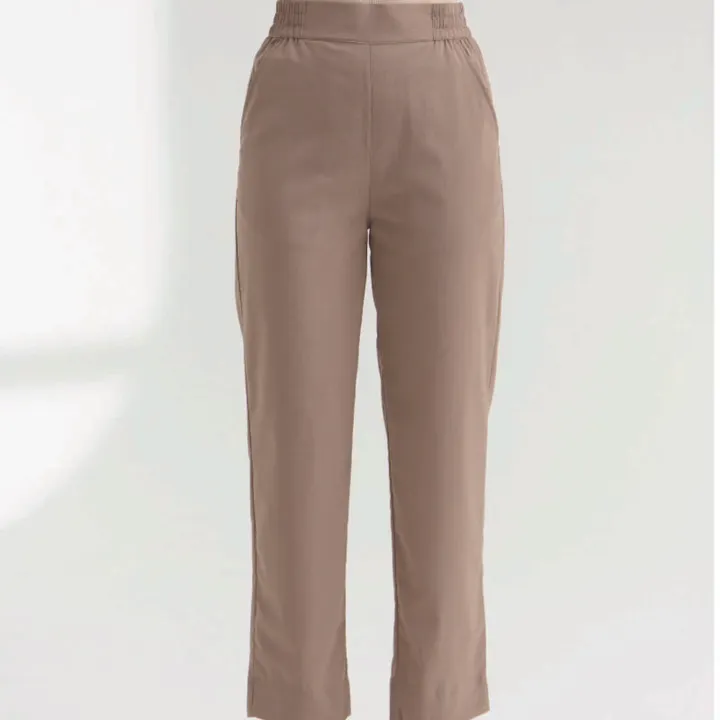 ・高弾力・高復元力のある強撚ポリエステル素材で、しわに強く快適な着用感 ・自然なドレープ感でシルエットが美しく、長時間着用してもしわになりにくい ・表面に微光沢と織り柄があり、涼しく肌に張りつかない質感 ・速乾性あり、家庭用洗濯機で洗えて管理が簡単 ・フロントタックとフェイクヒップポケットで体型カバー効果 ・360度Eバンドのウエストで着脱が簡単、サイズ互換性も高い ・裾にスリット入りで足元に軽やかさをプラス