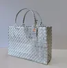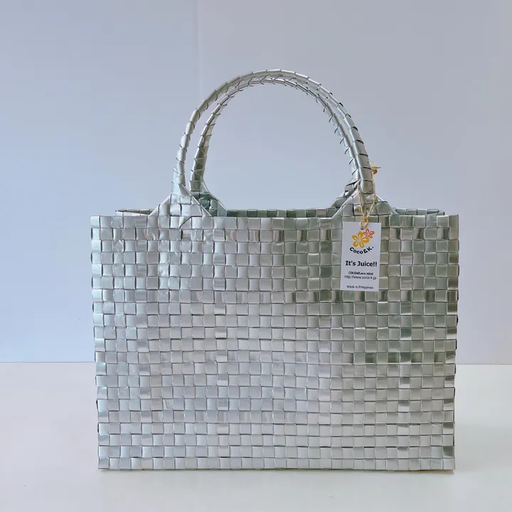 Coco&K.の定番バッグ 色違いでいくつもお使いいただいている方の多いKOTOですが その中でも一番人気のカラーがこちらの「シルバー」です。 フィリピンのジュースパックプリント工場で出るミスプリントの廃棄シート、 その裏側のシルバー部分を使っています。 シートを細いリボン状にカット、きれいに4つ折りにしてから手編みで仕上げていきます。 熟練の職人の手による、すべてがハンドメイドの一品です。 Coco&K.のシルバーカラーは、マットシルバーの中にほんの少し、 光沢のあるシャインシルバーをミックスして作っています。 派手過ぎず上品な輝きのシルバーカラーは長年のベストセラーです。 内側にはファスナー付きポケットが付いています。 A4サイズのファイルがちょうど収まるサイズです。 お仕事にも、お出かけにも、 カジュアルにも、ドレスアップした時も、 どんなシーンにも合わせやすい、シンプルで飽きのこない上品なスクエアトートです。 そして女性にも男性にも、年代を問わずお使いいただける Coco&K.の人気NO.1アイテムです。 アルミ素材のため軽くて丈夫!水濡れもOKです。 使い込むにつれて柔らかくなじんできます。 手作りのため多少のシワやよれがある場合がございますが 手仕事のぬくもりを感じていただけたら嬉しいです。