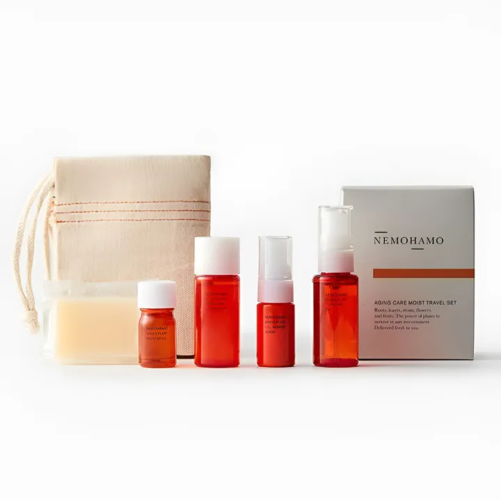 植物由来の美容成分をたっぷり含んだ、クレンジングオイル・洗顔ソープ・ブースターオイル・エイジングケア※1ローション モイスト・フルバリア美容液のトータルスキンケア5点セット。オタネニンジンをはじめ、ビタミンやミネラルを豊富に含んだ植物エキスが、弾むようなハリと潤いに満ちた肌へ導きます。 ※1 エイジングケア:年齢に応じたケア 〇フルラインをミニサイズで10日間分のスキンケア5点セット 旅行用にもお試し用にも使えるミニセット。マイルドな使い心地の「クレンジングオイル」に、コールドプロセス製法でじっくり熟成させた「洗顔ソープ」。ローションの浸透※1をサポートする「ブースターオイル」に、ハリのある潤い肌へと導く「エイジングケア※2ローション モイスト」、そして最後に潤いをしっかり閉じ込める「フルバリア美容液」の5点セットをご用意しました。 石油由来の原料を一切使用せず、植物をまるごと低温真空抽出法で丁寧にエキス化。ビタミン・ミネラルなどを含んだ良質な植物エキスが、ツヤやかで澄んだ肌へと導きます。 ※1:角質層まで ※2:年齢に応じたケア 〇NEMOHAMO特製の巾着袋付き 持ち運びに便利なNEMOHAMOオリジナルの巾着袋が付いています。旅行や出張などの外泊時にも、スキンケア用品を1つにまとめて携帯できるので便利です。コットン100%の生地を使用しています。 〇こんな方におすすめ ・旅行用やお試しで使いたい ・年齢肌対策をしたい ・キメの乱れが気になる 〇キー成分 ・オタネニンジン 日本では和漢として広く知られ、古くから重宝されているオタネニンジン。 対馬で農薬不使用で育てられた3年もののオタネニンジンの、ひげ根も葉も茎も花も、あますところなくエキス化しました。ハリ/ツヤ/整肌/保湿など、肌にうれしい効果が凝縮されています。 〇配合しない成分 石油由来合成香料、石油由来合成着色料、石油由来合成防腐剤、シリコン、鉱物油、石油由来合成界面活性剤 〇ブースターオイルの使用上のポイント 最後の一滴までフレッシュなオイルを清潔に使っていただきたいため、オイルキャップに空気弁を設けています。容器を逆さまの状態で静置すると、弁(空気穴)から空気が通り、ゆっくりと中身が出てきます。