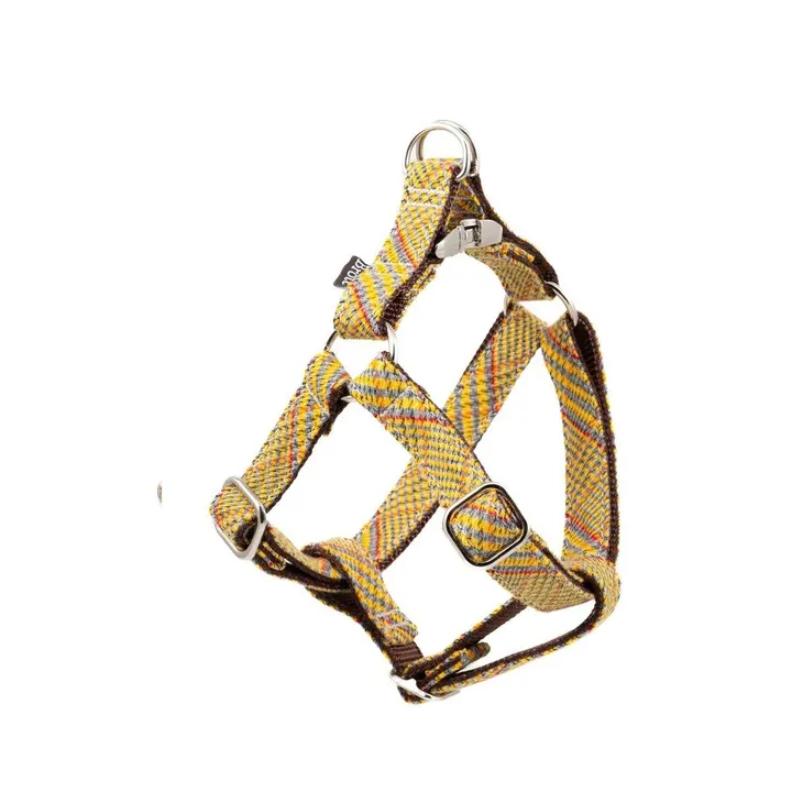 決して流行遅れにならないプリントがあるとすれば、それはチェック柄です。 今シーズンはよりアップデートされた新しい美学を取り入れ、冬を彩るトレンディなイエロー系チェック柄に仕上がりました。 表面生地は優しく肌触りの良いさわり心地。 ? このハーネスは非常に丈夫で心地よい手触りです。お散歩中に愛犬が快適に過ごせるようデザインされており、簡単で素早く装着することが出来ます。 ハードウェアには高品質のアルミニウムを使用し、ポリッシュ加工されています。 ? ※XXSサイズ(体重1.5?3キロ以下の超小型犬・子犬向き)は裏地ナイロン無しで薄めの素材感になります。 ? ? 素材 裏地:ポリエステル100%リボン(エコテックス認証取得)表地:アクリル80%、ポリエステル20%バックル:特許取得のアルミニウム製サイドリリース