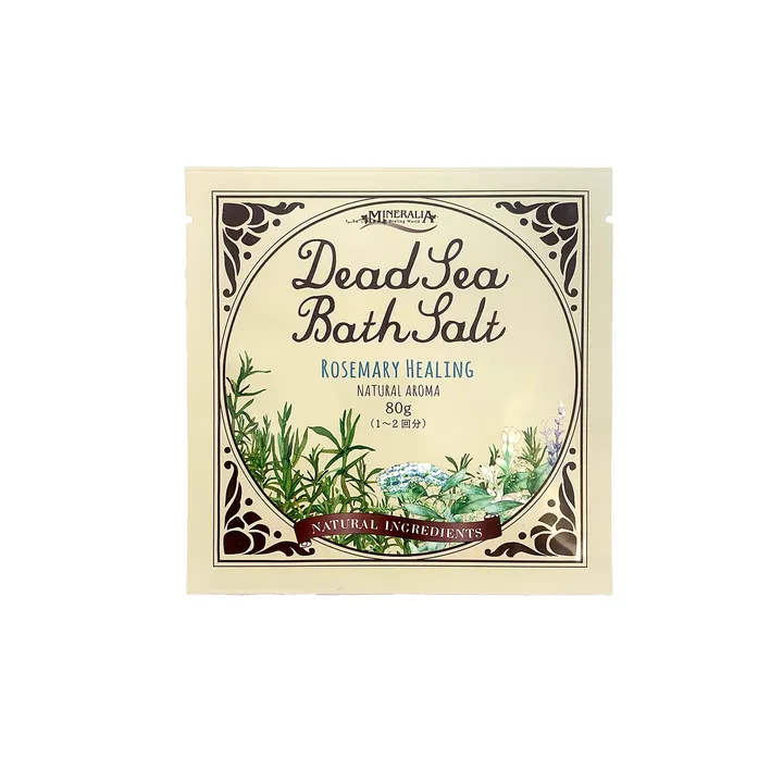 〈こちらのサンプルは、ネコポス385円(税込)にて発送可能です(80g 6袋まで)〉 100%死海ミネラル塩に天然精油、天然クチナシ色素を使用したバスソルトです。【合成香料・合成着色料 不使用】 死海塩にはマグネシウムを中心に、多種のミネラルが絶妙なバランスで含まれているのが特徴です。 ミネラルはお肌に潤いを与え、皮膚を健やかに保ちます。また、温浴効果で体を芯から温めます。独特な死海ミネラルのご入浴をご家庭でお楽しみいただけます。 サロン様等ではマッサージやトリートメント施術前のフットバスへのご利用も、体が温まり大変人気があります。 ■香り 〈ローズマリーヒーリング〉 配合精油:ローズマリー、ユーカリ、ヤロウ、ラベンダー、チュベローズ、レモングラス、ペパーミント ローズマリー、ユーカリなどの元気で力強いハーブの香りは疲れ気味の心身をすっきりと洗い流すようにリフレッシュしてくれます。 ■お湯の色 無色 ■ご使用方法 約160ℓ〜300ℓのお湯に40〜80gを入れて、かき混ぜてからご入浴してください。 ※お肌の状態や香りの好みでご自分に合う量を、又乾燥しているお肌には最初は少なめに入れてお試しください。 ※香りを抑えながらミネラル濃度だけを上げたい時はナチュラル(無香料)のデッドシーバスソルトを足して下さい。 ※ご入浴後は残り湯を放置せず早めに排水し、浴槽や循環フィルターを水洗いしてください。 ※色や香りがついている残り湯での、白色や下ろしたての衣類の洗濯はおやめください。