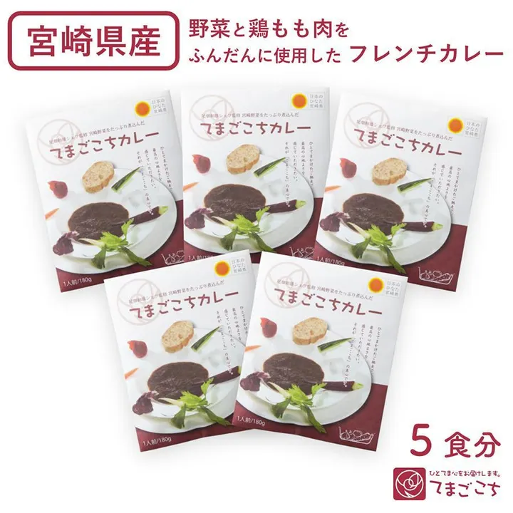 ご自宅で手軽に本格的なフレンチカレーが楽しめるレトルトカレーセット。宮崎県産の野菜・鶏もも肉をふんだんに使用し、食材の自然な旨みをゆっくり引き出すフレンチ技法で素材の旨味とコクを引き立てた甘口カレーはお子様や辛いものが苦手な方にもおすすめです。ギフトにもぴったり。 宮崎県国富町にあるフランス料理店「ラポール・ド・クニトミ」のオーナーシェフ・尾畑和雄氏監修のレトルトカレーは、宮崎県産の野菜をふんだんに使用し、100時間じっくり煮込んだ本格フレンチカレー。 召し上がり方: 【1】袋の封を切らずにそのまま沸騰したお湯の中で5分間温めます。 【2】ご飯にかけてお召し上がりください。 ※電子レンジを使用の際には、必ず中身をお皿に移しラップをかけて温めてください。ワット数によって加熱時間が異なりますのでご加減してください。 アレンジ例:オムカレー、カレーうどん、スープカレー、パンにつけてなど。 内容量:180g×5袋セット 原材料:野菜(玉ねぎ、人参、トマト)、鶏もも肉、カレールウ、りんご、バナナ、小麦粉、砂糖、チキンスープ、カレー粉、食塩、香辛料、カラメル色素、調味料(アミノ酸等)、酸味料、香料、香辛料抽出物(原材料の一部に乳、落花生、豚肉、オレンジを含む) 保存方法:直射日光を避けて、常温で保存してください。 製造者:宮崎食研有限会社(宮崎県宮崎市大字糸原4727)