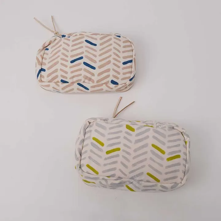 ガジェットポーチは、全面ファスナーで開閉がしやすく、PCのコード類を丸ごと収納でき、マウスがすっぽりと収まるポケットも付いています。 その他にも、おしりふきなどのベビーグッズやポータブルゲーム機器の収納にも活躍してくれます。    *内ポケット×3(ジッパー付×1) **BLOCKPRINT** ブロックプリントとは 木彫りの版でハンコを押すように1柄ずつ1色ずつプリントされたものです。 まずはアウトラインとなる柄のスタンプを押していき、その後色をのせていきます。 使われている色の数だけ、作業は複雑になっていきます。 全て手作業の為、染めムラやスタンプの境目などが少し出ていますが それがブロックプリントの良さでもあり、風合いとなっております。 機械化が進むこの時代にこの風合いをぜひお楽しみ下さい。 【ポーチ】【トラベルポーチ】【ブロックプリント】 【トラベル/旅行】