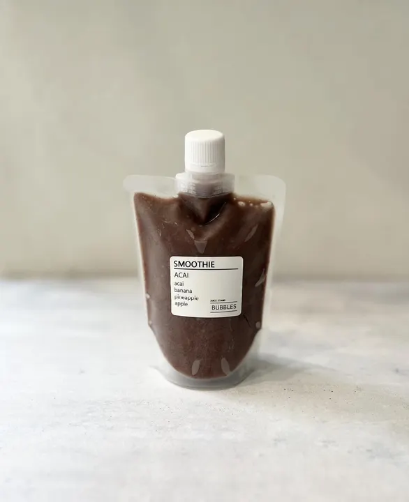 ☆「作りたて」にこだわるBUBBLESのスムージー。 これまで店頭販売のみでしたが、急速冷凍機を導入することで遠方のお客様にも提供できるようになりました。 鮮度を保った状態を冷凍でお届けします。 消費期限は冷凍保存で製造日より3ヶ月です。(ラベルに記載しております) 解凍してからよく振ってお召し上がりください。(当日中) BUBBLESオリジナル【SMOOTHIE】アサイースムージー(S size, 200ml)です。冷凍品で、いつでもフレッシュな味わいを楽しめます。アサイーを贅沢に使用した栄養満点のスムージーで、健康志向の方にもぴったりの一品です。 【内容量】200ml / アサイー(ブラジル)、バナナ、りんご、パイナップル オーガニックのアサイーを厳選し、こだわりの製法で作られたアサイースムージー。アサイーには抗酸化作用があり、美容や健康へのサポートが期待できます。また、バナナやオレンジジュースの自然な甘さが加わり、飲みやすく、朝食やおやつタイムに最適です。 ヘルシー志向の方にもぴったり。化学調味料や保存料、合成甘味料は一切使用しておらず、原料は素材のみで作られています。自然の甘みと栄養が凝縮されているので、安心してお召し上がりいただけます。 ※冷凍品のため、お手元に届いてからすぐに冷凍庫で保管してください。解凍後はお早めにお召し上がりください。
