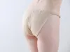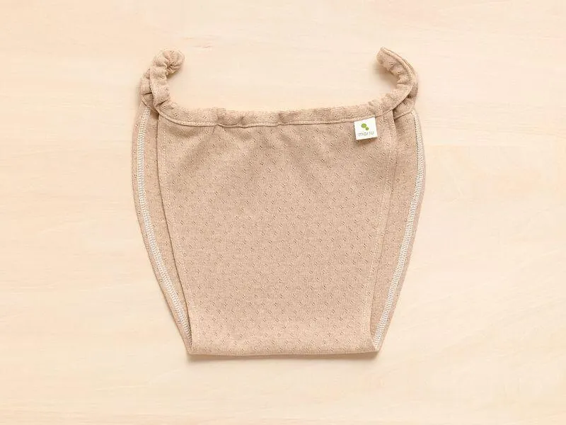 ※サンプルのため、パッケージに入れずにお渡しします。 「ふんどし」の良さをそのままシンプルに、現代のショーツの形に。 新月ショーツと並ぶ、マアルの定番商品です。 こちらは、無染色のオーガニックコットン「茶綿」を使用した満月パンツ。 生成りよりさらっとした感触です。 無農薬有機栽培で育てた綿を、極力化学物質を使わず、漂白も染めも一切せずに、国内で丁寧に編んだ生地です。 生地、そして縫い糸までフェアトレードのオーガニックコットン100%。 一般的な下着は伸縮性があり、廉価な化学繊維の糸で縫いますが、 肌が繊細な人は化繊糸に痒みを感じる人が多いため、独自の方法で1着1着、オーガニックコットン糸で縫っています。 綿の栽培から糸づくりまで、世界的なソーシャルプロジェクト=bioRe projectに担われており、 気持ちがいい!と感じた肌着がどこまで遡ってもマアルく気持ちのいいフェアトレードの関係で生まれたものであるようにと願っています。 品質表示ラベルは、あえて外側に。 取り外しやすいよう、大きめのミシン目で本体の縫い目とは別に取り付けてあります。 これも、肌刺激を減らす工夫です。 ゴム交換口を用意してあります(左前のマアルタグの内側あたり)。 お好みの緩め具合に調整したり、 太った、痩せた、妊娠したなどといった体の変化にも対応できます。 マアルのパンツは股上がかなり浅めです。 これは、ゴム部を骨盤輪の上に乗せることで、腸を締め付けないようにするためです。 だから、お腹の大きな妊婦さんでも履き続けることができます。 一見冷えそうに見えますが、 足の付け根(鼠蹊部)やお腹周りを締め付けないことで、 体温の上昇作用も大学との共同調査で明らかになりました。 サイズ:M(W64~70cm H87~95cm)     L(W69~77cm H92~100cm)      (W:ウエスト H:ヒップ)