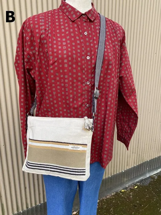 インドのフェアトレード生産者グループ MESH(メッシュ) で作られたショルダーバッグです。 MESHは、ハンセン病の患者さんやそのご家族が手仕事を通して自立できるよう活動している団体。このバッグには、彼らが一つひとつ丁寧に手織りした べサニーテープ が使われています。 本体は丈夫な 帆布生地。フロントポケットとショルダーストラップに織り柄がアクセントになり、シンプルながらも存在感のあるデザインです。 お財布、手帳、スマートフォン、筆記具などをすっきり収納できるちょうど良い大きさで、普段使いからお出かけまで幅広く活躍します。