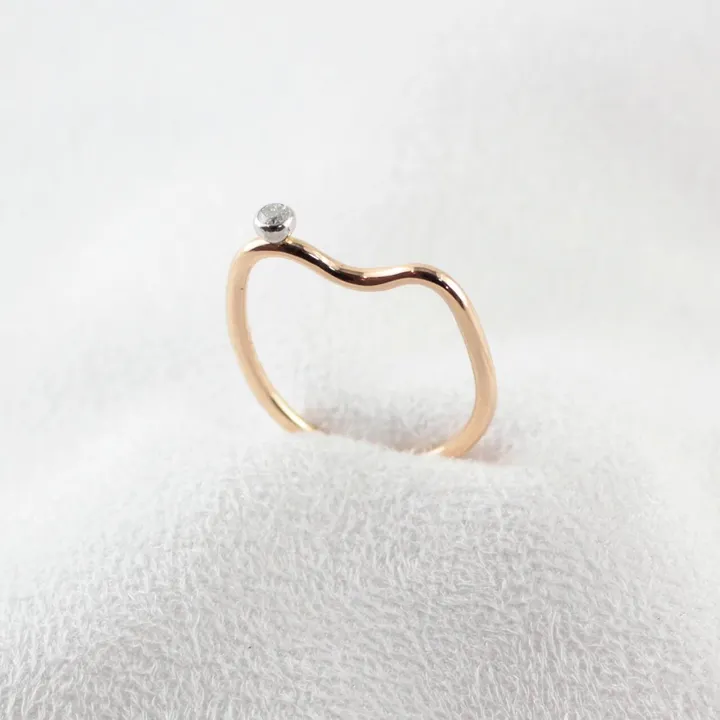 素材:K18PG、Pt900、ダイヤ0.05ct 参考写真サイズ:10号~13号 【指輪のサイズについて】 指輪の形状により、ご希望の普段のサイズの約3サイズは着けることが可能ですので、色々な指で使用する事が出来ます。 ○M JEWELRY スペインの建築家アントニ・ガウディ。彼が残した「美しい形は構造的に安定している。構造は自然から学ぶべきである」の言葉から着想を得て、自然の中にある曲線をコンセプトに、「M」という文字を表現、シンプルかつ美しいラインを追求しました。また、渦巻き・惑星・樹木の幹など自然界にある、もっとも単純な丸い形モチーフや、原石のそのままの美しさを活かし作品など、自然界の形に着目したコレクションです。