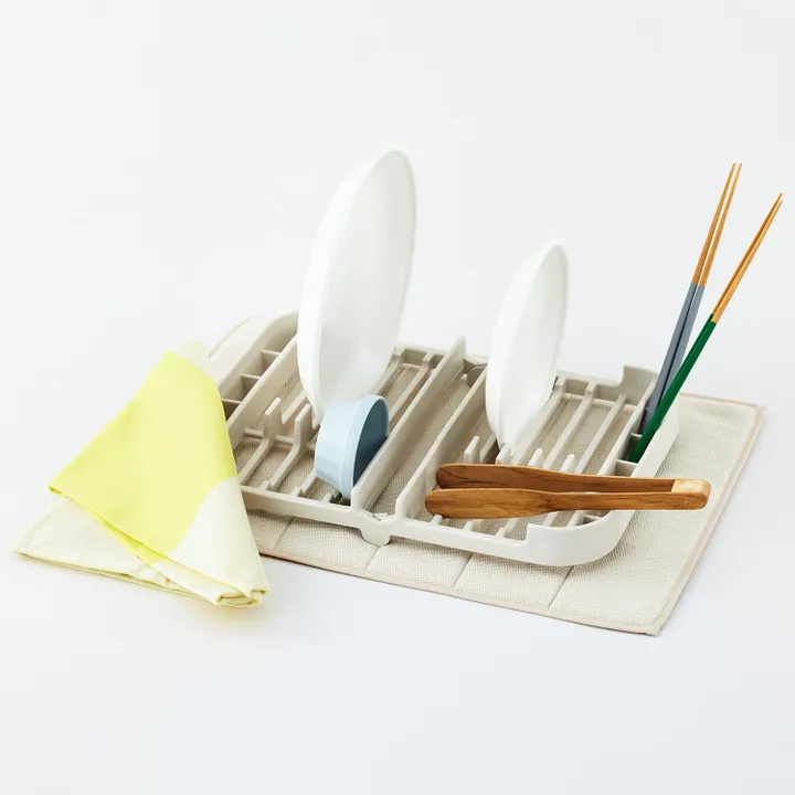 約2人分の食器を、コンパクトに乾かせる水切りラックが誕生。お皿やお椀をしっかり立てられる構造で、お箸やスプーンなども立てて乾かすことができます。ラック本体が食洗機で洗えるため、汚れてもお手入れが簡単で衛生的です。2人分の食器をしっかり乾かせるため、一人暮らしや二人暮らしの方はもちろん、3人以上のご家族でも、「食洗機にかけるほどでもない、ちょっとした洗い物をサッと済ませたい」といった食洗機との併用や、「食洗機に入りきらなかった食器を乾燥させたい」といった時にもとても便利です。また、使わない時に半分に折りたたんで収納できる、省スペース設計でキッチン空間の邪魔になりにくいです。同シリーズ「プリスベイス 水切り吸水マット」と併用してお使いいただくと、より洗い物が快適です。水切りラック、吸水マットは別売りです。