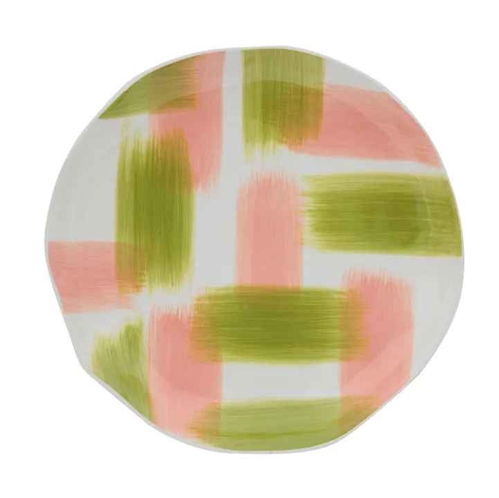 ほんのり乳白色の生地に、二色の刷毛目を縦横大胆に描いたシリーズ。 手描きならではの勢いと潔さが、テーブルに元気な表情をプラスします。 存在感があり、普段の食事もちょっとしたおもてなしも、気軽に楽しく彩り且つお手頃価格なのも嬉しい一品です。 直径約20cmのプレートは一般的に中皿として、大きめの取り皿、パン皿、デザート皿など、非常に万能で出番が多いサイズです。 もちろんメイン料理やワンプレートランチにも◎ 刷毛跡があることで平らなプレートに立体感が生まれ、個性的な色合いも料理が引き立つ味方につけます。 更に緩くウェーブがかったリムが、器の表情にアクセントをもたらします。 また追加情報としては、持ち上げた時に重量感を感じるところでしょうか。安定感のあるプレートです。 お好きなカラーの組み合わせでペア需要にも対応可能です。 お揃いのマグカップ、ボウルとともにボリューム満点のギフトセットもできます。