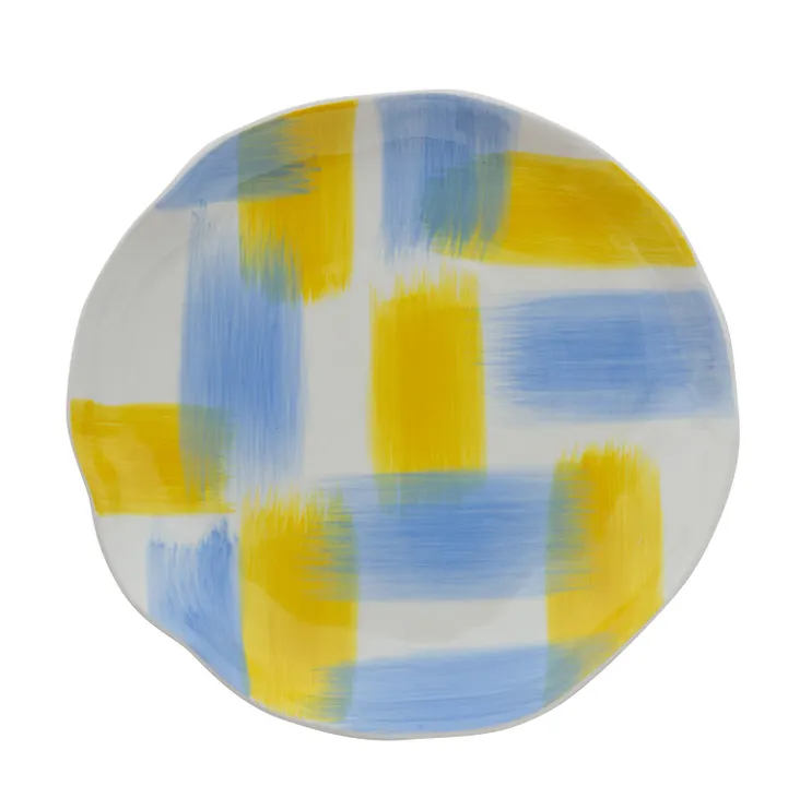ほんのり乳白色の生地に、二色の刷毛目を縦横大胆に描いたシリーズ。 手描きならではの勢いと潔さが、テーブルに元気な表情をプラスします。 存在感があり、普段の食事もちょっとしたおもてなしも、気軽に楽しく彩り且つお手頃価格なのも嬉しい一品です。 直径約20cmのプレートは一般的に中皿として、大きめの取り皿、パン皿、デザート皿など、非常に万能で出番が多いサイズです。 もちろんメイン料理やワンプレートランチにも◎ 刷毛跡があることで平らなプレートに立体感が生まれ、個性的な色合いも料理が引き立つ味方につけます。 更に緩くウェーブがかったリムが、器の表情にアクセントをもたらします。 また追加情報としては、持ち上げた時に重量感を感じるところでしょうか。安定感のあるプレートです。 お好きなカラーの組み合わせでペア需要にも対応可能です。 お揃いのマグカップ、ボウルとともにボリューム満点のギフトセットもできます。