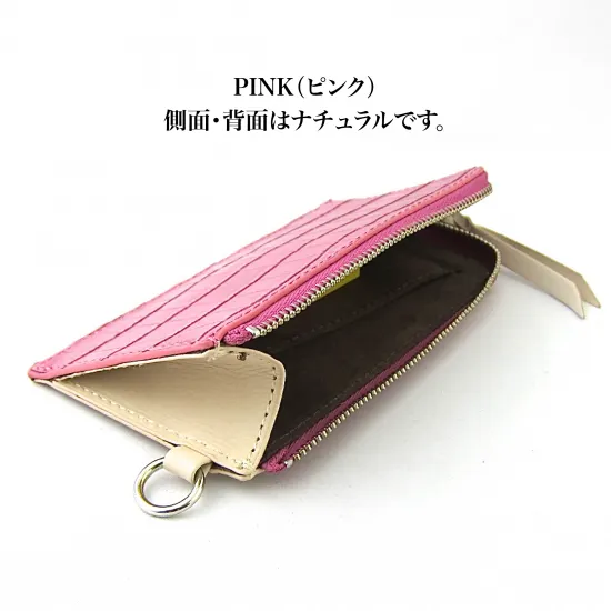 L字ファスナーのフラグメントケースです。スリム&コンパクトなミニマルサイズなので小さなバッグにもスッキリと収まります。 大きなマチ付きなので中身は見やすく、出し入れも簡単です。外側に4枚のカードを収納可能、大きなサブポケットも付いています。また内側にも名刺サイズのポケットを付けました。 大きめの丸カンを付けたので別売りのストラップを使って首から下げたり、バッグに取り付けたり、シーンによってはミニウォレットやパスケースとしても使える、キャッシュレス時代にとても便利な必需アイテム。ミニマリストに最適なケースです。 素材はクロコダイル柄の EMBOSSED LEATHER(型押しレザー)とナチュラルカラーのFIANCHI VACHETTA(スムースレザー)を組み合わせ、内側には鹿皮のように滑らかなマイクロファイバースエードを配色しました。 サイズ:約 150 × 85 × 20 mm 外 側:EMBOSSED LEATHER(型押しレザー) 外 側:FIANCHI VACHETTA(スムースレザー) 内 側:マイクロファイバースエード 色・柄:BLACK/ NATURAL、PINK/ NATURAL 個 装:上下貼り箱 名入れ:不可