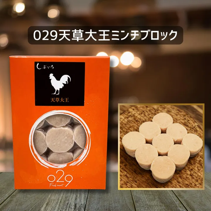 熊本県の高級地鶏「天草大王」です。 天草大王は、最大の背丈が90cm、体重約7kgにもなる堂々とした風格が特徴的です。自然豊かな天草の地でストレスなく健康的に育てられた天草大王。 肉質は、硬すぎず柔らかすぎない絶妙な歯ごたえ。味は、ほのかな甘みとコクがありながらもしつこさやクセがなく、一度食べたらその味わいがいつまでも鮮明に記憶に残るほどのおいしさです。 ビタミンAがブロイラーの10倍含まれていて、高タンパク、低カロリーのヘルシーミートです。 しぶいちの029ミンチブロックは、ヒューマングレードの食材だけで作られた無添加ドッグフード/キャットフードです。 新鮮な生肉をミンチにしてキューブ状に成型しています。冷凍のまま小分けがでるので、使いたいときにさっと取り出せます。無駄なく使えるため、忙しい日常にもぴったりです。保存料や添加物を一切含んでおりませんので、安心してご利用いただけます。手作りご飯の材料としてどうぞ。 ※冷凍商品です。goooodsのシステムの都合上、ご発注後に、クール便代が別途加算されます。ご了承ください。