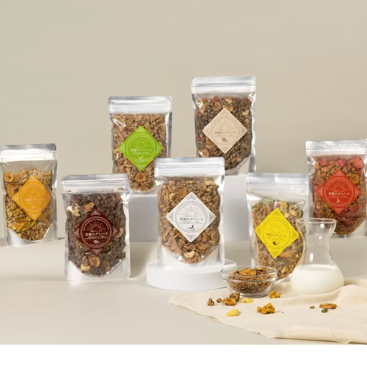 一番人気のオリジナル商品 至福のグラノーラ シナモン&黒糖バナナと季節限定商品が2種類がセットになったお試しセットです。 美味しい食べ方レシピ付き! 季節限定商品はその時期売れ筋のものをこちらで選んでご提案させていただきます。 (※写真7枚目〜はお届けする一例です) 別途ご希望がある場合は、発注時にメッセージにてご連絡ください。 * スパイスのちからをもっと気軽に取り入れてほしい。 そう考えてたどり着いたのが「至福のグラノーラ」。 毎日の健康と美をサポートできるよう原材料を厳選し、ひとつひとつ手作りで丁寧に焼き上げています。 ひかえめの甘さの中に、たっぷり香るスパイスに包まれて幸せな朝を迎えたいあなたへ。 忙しい日でも、癒しの香りで心を満たし、からだに優しい素材で元気に1日をスタートしていただけたら幸いです。 ★至福のグラノーラは、全て宮城の社会福祉法人「はらから福祉会」でひとつひとつ丁寧に手作りされ、発送されています。 売上が障害を持つ方の月額賃金と自立支援に繋がっております。厚く御礼申し上げます。