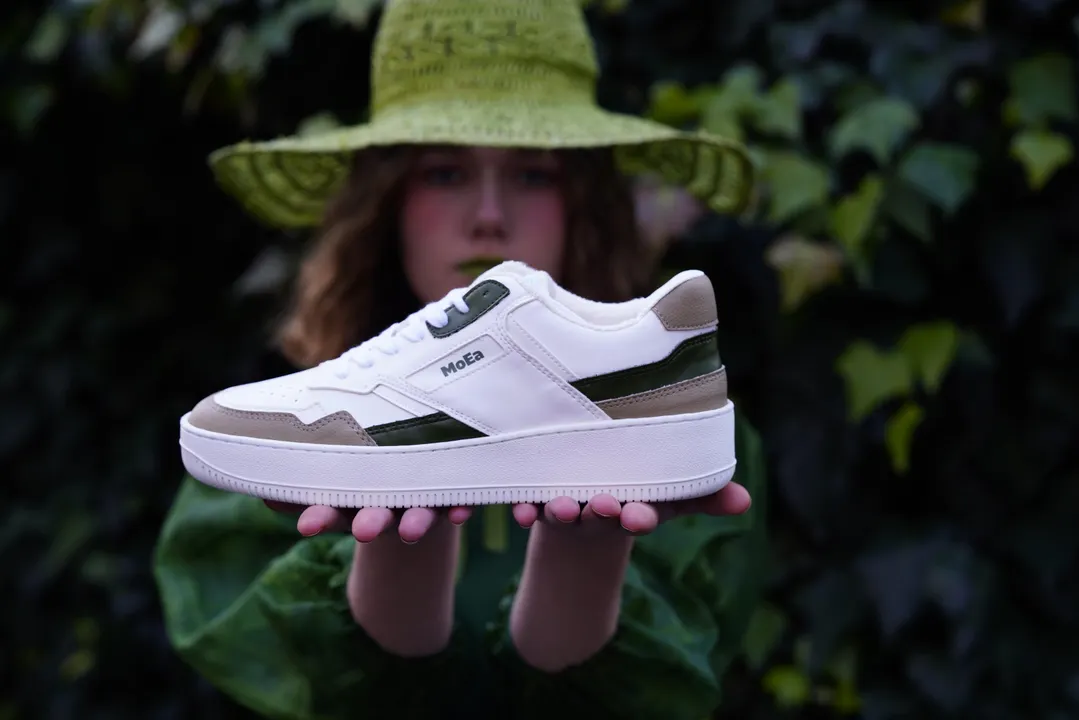CACTUS(サボテン)のVEGANレザーをアッパー全てに使用したモデルです。白色やグレーの部分もアッパー全てがサボテンのVEGANレザーです。 インソールや裏地、ソールなど全てのパーツがリサイクル素材で構成されています。