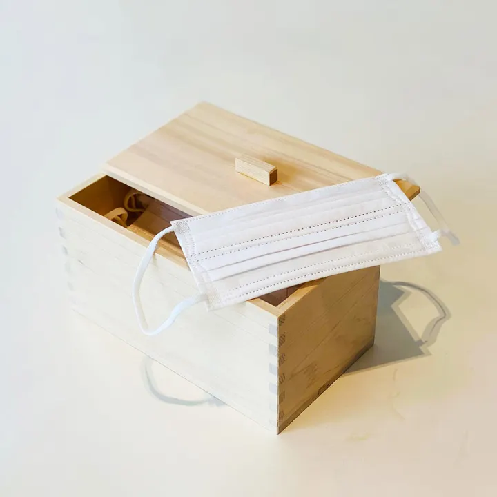 日本三大美林(木曾檜・津軽ひば・秋田杉)の代表とも言われる「木曾檜」を素材に使用した特別なマスク用の収納ケース。この地域のヒノキ材は、さかのぼること安土桃山時代、豊臣秀吉が大阪城や伏見城などの建築用材としたのが始まり。江戸時代徳川家康は木曾を尾張徳川領として多くの木材を活用しました。尾張藩の管理は明治2年まで続き、その後国家の所有する官林となりました。伊勢神宮では20年毎に式年遷宮が行われており、鎌倉時代までは神宮の山からご用材を伐り出していましたが、良材の枯渇により、江戸時代からは木曾谷からご用材をきり出すようになりました。「ひのき」には抗菌・消臭効果があるといわれており、マスクを清潔に保管するのに適しています。ほのかなひのきの香りと滑らかな手触りが心地よく、高級感のある仕上がりで、玄関やリビングのインテリアとしてもおすすめです。50枚入りのレギュラーサイズ不燃布マスクがすっぽりそのまま収まるサイズです。形状は出し入れが容易な段付きのせ蓋式(取手付き)。商品の角面に見える四角の模様は「蟻組接ぎ」という工法を採用している証。無垢板を直角に接続する際、釘などの異素材を使わずに強度を保ちたい時に使われる伝統的な職人技です。
