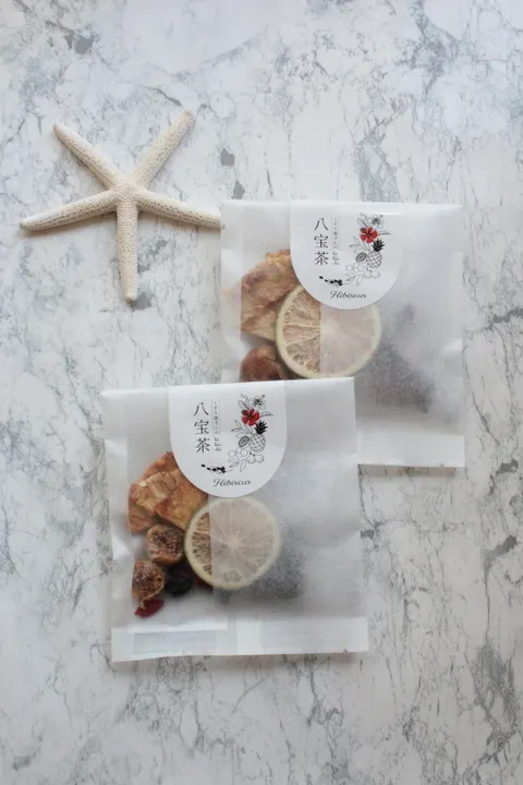 安心素材で食べても美味しく、 心もほっとリラックス。 くすり屋さんの八宝茶~ハイビスカス~ 砂糖不使用 山口県オリジナル柑橘『長門ゆずきち』使用 さわやかな酸味とフルーツの甘みが美味しい飲んで美味しい、食べておいしい「八宝茶(ハイビスカス)~ゆずきち~」です! 地域・数量限定で以前販売いたしましておりましたが、大変ご好評をいただきまして、通常のラインナップに加わりました! 酸味のあるハイビスカスの花のお茶をベースに、パイナップルや竜眼肉、クコの実、レーズンなどのドライフルーツをミックス。 輪切りの柑橘は、山口県長門市で育てられている山口県オリジナル品種『長門ゆずきち』のフリーズドライです。柔らかな酸味とさわやかな風味が特徴的です。 氷砂糖などの甘味料は加えていませんが、フルーツの甘みとハイビスカスの酸味が美味しいお茶に仕上がりました。 今までにない、アイスティーで美味しい八宝茶です。 もちろん、通常通りホットでも美味しくお召し上がりいただけます。 *********************************** 八宝茶(パーポーチャ) Ba Bao Cha 「八」には「たくさん」という意味があるそうです。 八宝茶には、茶葉に加えて、ドライフルーツやハーブに使用される花や葉、ナッツなど、たくさんの体が喜ぶ素材が入っています。 『くすり屋さんの八宝茶』は、漢方薬にも使用される素材を使用した薬膳茶です。 漢方薬局だから、素材にこだわりました。 安心素材で食べても美味しく、心もほっとリラックス。
