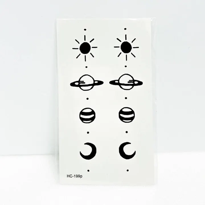 4つの神秘的な惑星のタトゥーシール。4個x2のデザインが1枚に入っています。首元や二の腕の内側に貼るのがおすすめ。