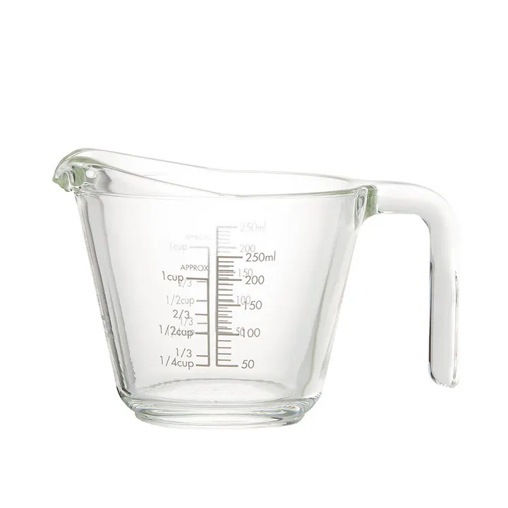 内側から見えるメモリがポイント。計量カップを使うときの目線を考え、上からのぞいたときに見やすくはっきり見えるメモリをつけました。液体だけでなく「さとう」「こむぎこ」のメモリも付いています。耐熱ガラス製なので、湯せんや電子レンジなど温めながらの調理にも安心して使えます。