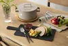 木の繊維に合成した素材を使用している耐久性に優れたカッティングボードです。表面は非多孔性で細菌が侵入しにくく、薄型なので食材を切ってもそのままお鍋にサッと入れることができます。水切れがよく、お手入れも簡単で食器洗浄機にもお使いいただけます。ハンドル付きのカッティングボードなので毎日のお料理だけでなく、盛り付け用のボードとしても大活躍!