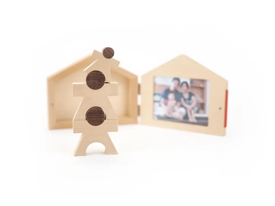 mapa miniは小さい家族サイズの「幸せ」と「絆」をイメージしてデザインしています。 家の中に子どもとパパ・ママが一緒にいる。大切な家族の日常を写真と人形で感じることができる作品です。 木箱裏には家族の名前やメッセージが書けるようになっています。フォトフレームとしてはもちろん、おもちゃとしても日替わりで積み木のパターンを変えて楽しんでいただけます。