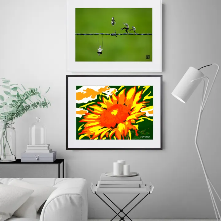 アーティスト -PROFILE- MOMOCO(モモコ) 「色」をこよなく愛する画家、ライブペインター。 躍動感あるアートにも関わらず、服を一切汚さず短時間で音楽と同時に描き上げる。そのパフォーマンスと巨大アートは観る人を魅了する。 前職は某有名ファッションブランドにてデザイナーとして活躍。その経験の中で養われた「色とデザイン」の絶妙なバランスを活かしつつ、トレンドを取り入れ進化し続けるアートを目指す!国内外問わず、精力的にアートと向き合い発信を続けている。 【作品について】 ビタミンカラーが目を引く!ポップなデザイン 眺めるだけで日々の活力になるような、そんな元気をもらえる素敵な作品 子供部屋や、キッズルームにもおすすめです 作品名:himawari Ⅳ 手法:デジタル、イラスト ペーパー:高品質半光沢紙 マットカラー:白 マット*:DXホワイト芯 100%バージンパルプ/PH7・中性紙(2mm厚) ※全てのアートにマットがつきます フレームカラー:黒、白、無垢(3種類から選択) ※マット付のため通常とはフレームサイズが異なる規格となります。 【マット*とは?】 アートポスターの周りに挟んだ厚紙の事。 マットを使わない時に比べ余白により広がりが生まれ、作品の新たな一面を引き出せ作品の見栄えがグッと良くなります。また、額縁のガラス面と作品が直接触れたままにしておくと、くっついて作品を傷つけることがあります。マットを使用することでガラスと作品の間に空間ができ、作品を保護することができます。ブランドコンセプトにより全てのアートにマットがつきます。 ー ファッションのようにアートを ー 私達が掲げるコンセプトです! 毎日着替えるファッションの様に、アートも気軽に飾り変えて欲しい... 一旦飾り終えたアートにも光を当ててほしい... ポスター単体、またはリピートで中身だけのポスターを購入された方に"専用のハンガー"をセットでお届け。 「今までに無い!新しいアートの飾り方を提案」 飾る事がなくなった前のアートをハンガーにかけて洋服と一緒にかけてもらう。 その日の気分や、モチベーションですぐに取り換えられる様に。 もちろん、魅せる収納としても今までにないおすすめの飾り方です。