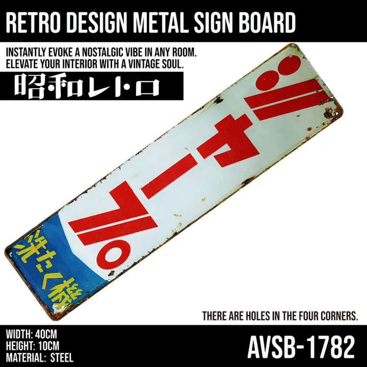 人気の昭和レトロザインのノスタルジックなビンテージ風サインボードです。 こちらは40X10CMサイズです。 雑貨屋さんはもちろん駄菓子屋さんにも人気です。又、インバウンドのお土産にも最適です。 お部屋・ガレージ・お店・カフェ・店舗のイメージ作りやイメージアップ、ディスプレイ、お部屋のインテリア、壁飾り、催し物、など幅広く活躍します! また掛けやすいように4隅に穴が開いているので取り付けも簡単です。  スチールの看板は日本各地で街頭広告、店内用看板として商用看板として用いられていました。 昭和レトロのデザインなのでお部屋やガレージを昭和スタイルに装飾可能です。 DIY、エイジング塗装、アンティーク塗装、男前系 などのリメイク家具やリメイク雑貨とも相性抜群です。 錆びているように見えますが実際には錆びておりませんのでお部屋を汚すことなく飾っていただけます。