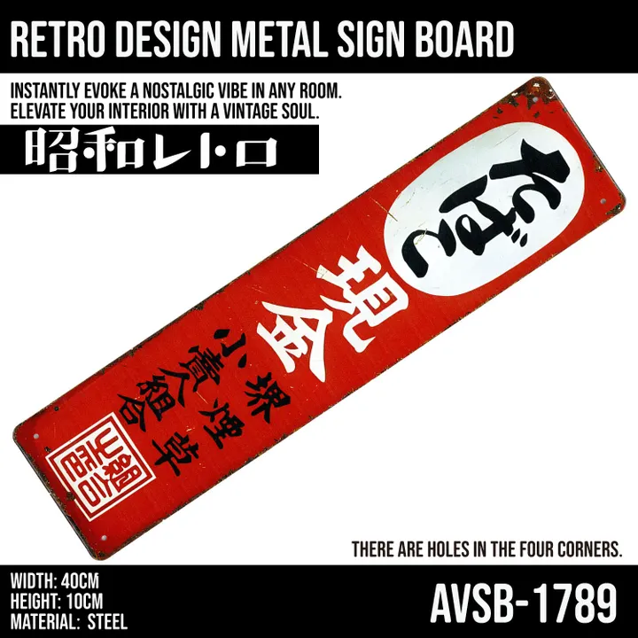 人気の昭和レトロザインのノスタルジックなビンテージ風サインボードです。 こちらは40X10CMサイズです。 雑貨屋さんはもちろん駄菓子屋さんにも人気です。又、インバウンドのお土産にも最適です。 お部屋・ガレージ・お店・カフェ・店舗のイメージ作りやイメージアップ、ディスプレイ、お部屋のインテリア、壁飾り、催し物、など幅広く活躍します! また掛けやすいように4隅に穴が開いているので取り付けも簡単です。  スチールの看板は日本各地で街頭広告、店内用看板として商用看板として用いられていました。 昭和レトロのデザインなのでお部屋やガレージを昭和スタイルに装飾可能です。 DIY、エイジング塗装、アンティーク塗装、男前系 などのリメイク家具やリメイク雑貨とも相性抜群です。 錆びているように見えますが実際には錆びておりませんのでお部屋を汚すことなく飾っていただけます。