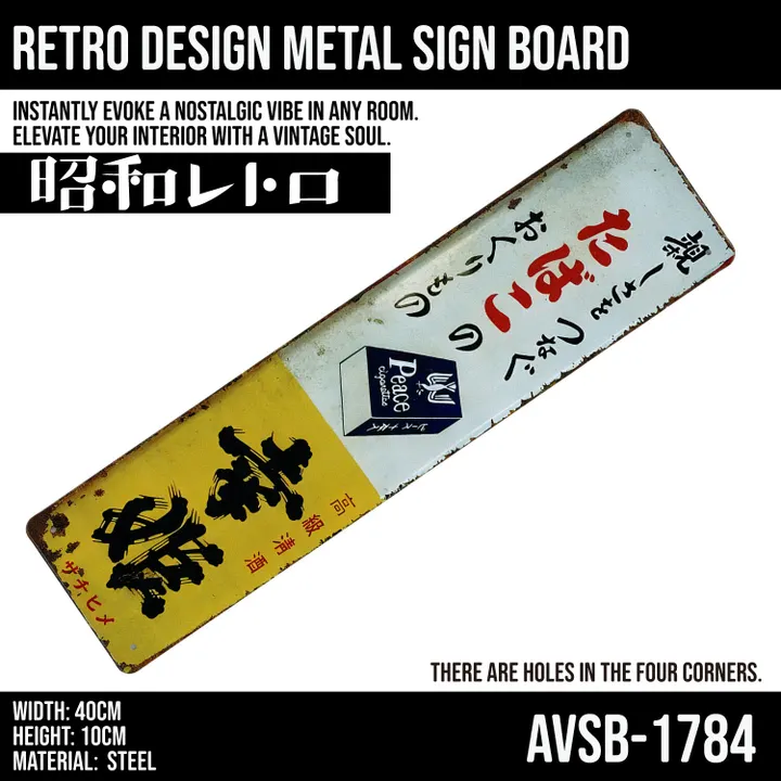 人気の昭和レトロザインのノスタルジックなビンテージ風サインボードです。 こちらは40X10CMサイズです。 雑貨屋さんはもちろん駄菓子屋さんにも人気です。又、インバウンドのお土産にも最適です。 お部屋・ガレージ・お店・カフェ・店舗のイメージ作りやイメージアップ、ディスプレイ、お部屋のインテリア、壁飾り、催し物、など幅広く活躍します! また掛けやすいように4隅に穴が開いているので取り付けも簡単です。  スチールの看板は日本各地で街頭広告、店内用看板として商用看板として用いられていました。 昭和レトロのデザインなのでお部屋やガレージを昭和スタイルに装飾可能です。 DIY、エイジング塗装、アンティーク塗装、男前系 などのリメイク家具やリメイク雑貨とも相性抜群です。 錆びているように見えますが実際には錆びておりませんのでお部屋を汚すことなく飾っていただけます。