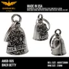 アメリカ製ガーディアンベル社製ガーディアンベルです。 MADE IN USA アメリカ製 交通安全 魔除け 御守り ガーディアンベル アメリカのライダーの間には、事故や、転倒の原因は「道路にひそむ悪魔」によるいたずらだという伝説があります。悪魔は走る者に悪戯やトラブルを運んできます。このベルは美しい音色で悪魔たちを追い払うと言われ愛されています。そんな悪魔のいたずらを防ぎ、御守りとなるのが、守護者のベルという意味を持つガーディアンベル。 日本でも鈴の音(ね)は神道では魔除けの音と言われています。ピューター製の鈴でいい音色でガーディアンベルはデザインも様々あります。 またガーディアンベルにまつわる伝説として、プレゼントとして送られたベルの効果は、自分で手に入れたものの2倍になると言われています。 それゆえに彼氏・彼女・友達・家族へのプレゼントとしての人気も非常に高まっています。 シルバーアクセサリーのようにおしゃれに装着できて素敵な音色を奏でるガーディアンベル。 バイカー以外にも自転車や旅・交通安全のお守りとしてお使いいただけます。 カバン・ランドセル・キーホルダー・ペットの首輪等に付けてお使いください!! ※タイラップ等でバイクのフレームにも簡単に取り付けできます。 アメリカンモデルだけではなく、旧車ファン、レプリカライダーまで、さらにバイクだけでなく、自転車や車にもピッタリな御守りとなっています。 アクセサリーとしても人気で、アイディア次第で車体だけでなく、キーホルダーや鞄など、どこにでも付けておしゃれに楽しめます。