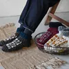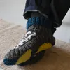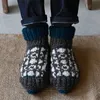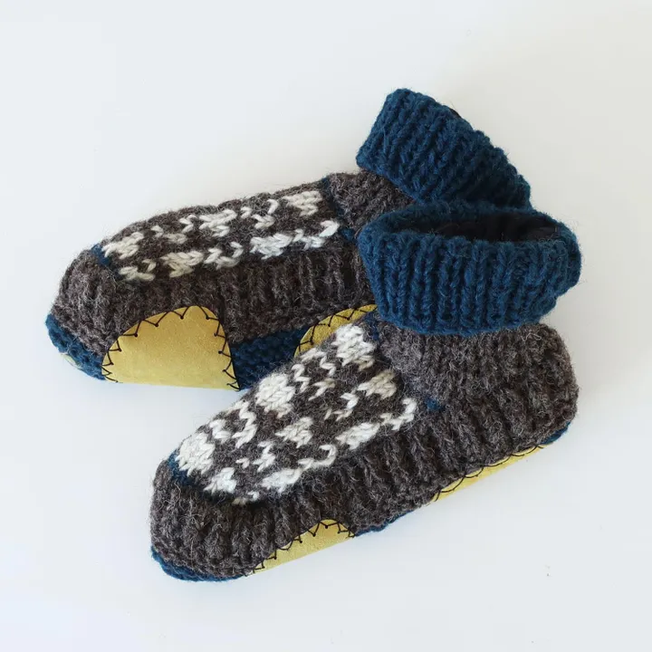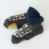 月の満ち欠けをイメージした模様のルームシューズ。落ち着いたトーンでカラフル過ぎず大人にも使いやすい。足元を冷えから守ってくれる。ギフトにもおすすめ。レザーパッチ付。