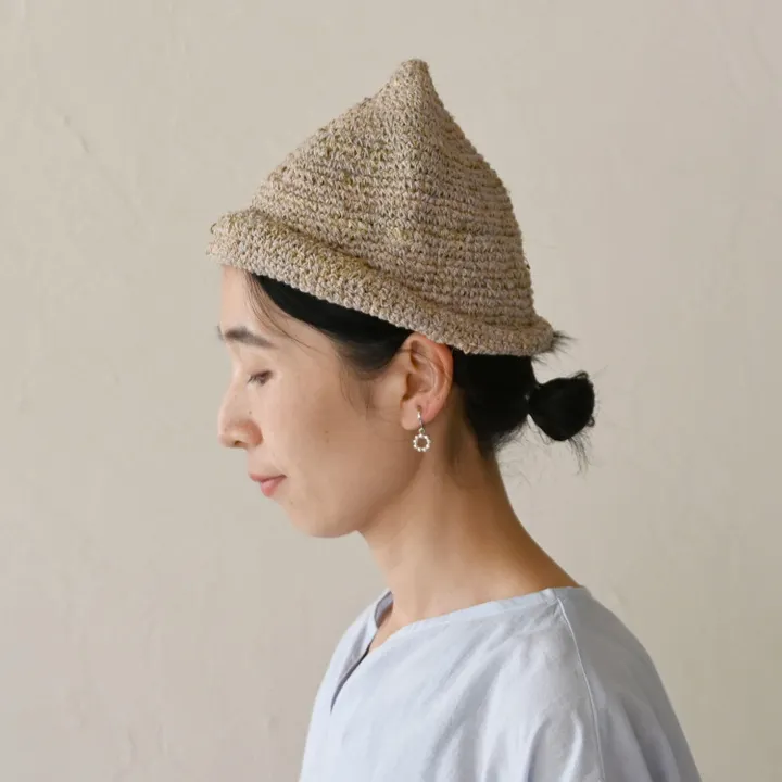 ナチュラルなヘンプとコットン糸で手編みされた帽子。少し先がとんがっていて、かぽっとかぶるだけで、その日の気分が上がります。カジュアルなコーデにぴったり。