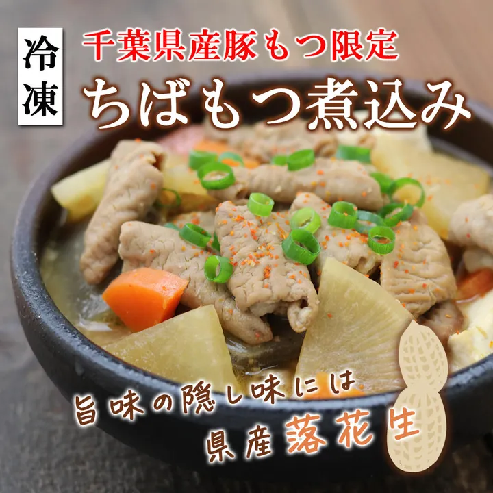 本品は冷凍品です (各注文の商品発送時に送料を設定) ※配送・送料の下部「配送・送料に関する補足」をご確認ください -------- 千葉県の良質な豚もつを丁寧に仕込み 隠し味に千葉県産落花生を加え、 厳選した調味料で柔らかく仕上げました。 臭みのない自然なコク・旨味だから汁まで美味しく召し上がれます。 野菜からの甘みがあり、砂糖使用量はひかえめです。 にんにく、しょうがも国産原料にこだわっております。 県内有名施設やこだわり飲食店に納品実績のある、 知る人ぞ知る!こだわりのちばもつ煮込みです。 ★本製品は、たっぷりの野菜を加えていただき、 水で濃度を調整できるように濃い目の味付にしてあります。 お好みで、具材、味噌、水分などを加えてご活用ください。 <お召し上がり方> ●本製品を解凍し、中身を大きめの鍋に移して、たっぷりの野菜と一緒に加熱して お召し上がりください。 ※ 増量させる前提の味付のため、濃厚です。 ●お召し上がり例(約15杯分 1杯180gとして) 本品1袋に対し、野菜(大根・人参等)・こんにゃく等 約800g、 豆腐1丁、水 約700cc、みそ大さじ4(70g程)を加え、 野菜が柔らかくなる程度に煮込んでください。 ☆商品に野菜は入っておりません。具材はお好みで加えてください。 ☆水と味噌の分量は、お好みで調整してください。 ※ たっぷりの野菜を加える場合は、水・味噌を加えなくても大丈夫です。お好みで調整ください。 ※ コチュジャン等を少し入れるとグッとつまみ系の味になります。 千葉県産豚もつ煮/通販/千葉市名物/もつ煮込み/業務用/千葉産直サービス製造/球場めし