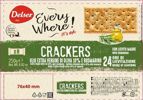 ローズマリーを生地に練りこみ、オリーブオイルで焼き上げたクラッカー。 オリーブオイルを使ったヘルシーなクラッカーです。 ローズマリーの香りが爽やかな味わいとなっております。 使いやすい10枚入りパックの8袋入り。 そのままでももちろん、ハムやチーズなどのトッピングをしていただいても美味しくお召し上がりいただけます。 【Delser】(デルセール) 1891年設立以来、常に最新の設備から生み出されるクラッカー。 その高いクォリティと伝統に恵まれた素朴な味はヨーロッパ各国で 高い評価を得ています。