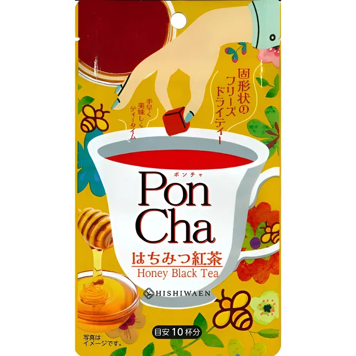 PonCha(ポンと入れたらすぐ出来るお茶) アルゼンチン産のはちみつを使用した風味の良い紅茶です。 キューブ型のフリーズドライティーです。 コンパクトで軽く、持ち運びが楽です! 『エコでかんたん あたらしい』を体験してください。 かんたん便利、あたらしい。水やお湯が有れば、いつでもどこでも誰でも簡単に美味しいお茶が楽しめるフリーズドライティ—です。 軽くてゴミも出ないので、オフイスはもちろん、アウトドアやキャンプのお伴に最適です。 <開発ストーリー> 近年、急須離れが進み、お茶に「手軽さ」が求められる時代になりました。コンビニやスーパーへ行けば、有名な市販茶がズラッと並び、出先でも簡単にお茶が飲める一方で、酸化防止剤の問題や、ペットボトルがエコではない等の問題があります。 そんな中、出来るだけ「エコ」で「手軽」にお茶が飲めるような商品は出来ないのかと考えたのがPonCha開発のきっかけであり、その具体的なアイデアが「フリーズドライ」という形でした。 菱和園では、全国から厳選して茶葉を仕入れ、丁寧に焙煎しており、“美味しいお茶”へのこだわりがあります。こうした課題に対し、毎日が挑戦・工夫の連続でした。そして、どうにかして世に出したいという思いで、3年という開発期間を経て、ついにフリーズドライティー「PonCha」が完成したのです。 私たち菱和園は創業50年を越えるお茶メーカーですが、伝統的な職人技を大切する一方で、時代の流れに合わせた柔軟な思考も大切と考えております。PonChaという全く新しい「フリーズドライティー」という市場が拡がり、お茶が好きな人たちがますます増えてくれたら、嬉しい限りです。ぜひ、ポンっと気軽にPonChaを味わってみて下さい!