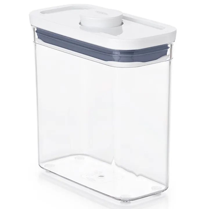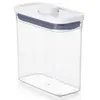 "魅せる収納"で人気のポップコンテナ フタの真ん中についているボタンを押すだけで開閉ができ、ポップアップしたボタンはそのままハンドルとして使えるドライフード用の保存容器です。調理中や、片手がふさがっていても、ワンタッチ操作で密閉が可能です。 フタの形はミニスクエア、スモールスクエア、ビッグスクエア、スリムレクタングル、レクタングルの5種類。高さは小さいほうから順にミニ、ショート、ミディアム、トールの4種類です。 高さはミニを基準にミニの2倍がショート、3倍がミディアム、4倍がトールと全てのフタの形に共通しているので、カウンターや戸棚の中でスッキリ整理整頓ができます。サイズ違いでもきれいにスタッキング(積み重ねて収納)ができます。 スクエア形状の容器は省スペースで収納できるだけでなく、掴みやすく、角から中身を注ぎやすいのも特徴です。毎日使うものだからこそ、使い勝手の良さを追求した保存容器です。 また、ポップコンテナに合わせてお使いいただける各種アクセサリーもあります(別売り)。フタの裏に装着して収納できるので、別にスプーンを用意したり、コンテナの中で埋まって見えなくなってしまうこともありません。 ポップコンテナは全部で18サイズありますので、入れるものの量や形にあわせてお選びください。フタは内側のパーツを取り外してお手入れが可能です。ボタンのついているフタ以外は漂白剤がご使用いただけます。すべてのパーツは食器洗い乾燥機(低温設定)がご使用いただけます。 適合アクセサリータイプ: ポップスクープ / コーヒースクープ / 粉ふるいスクープ / ライスカップ / シュガーキーパー