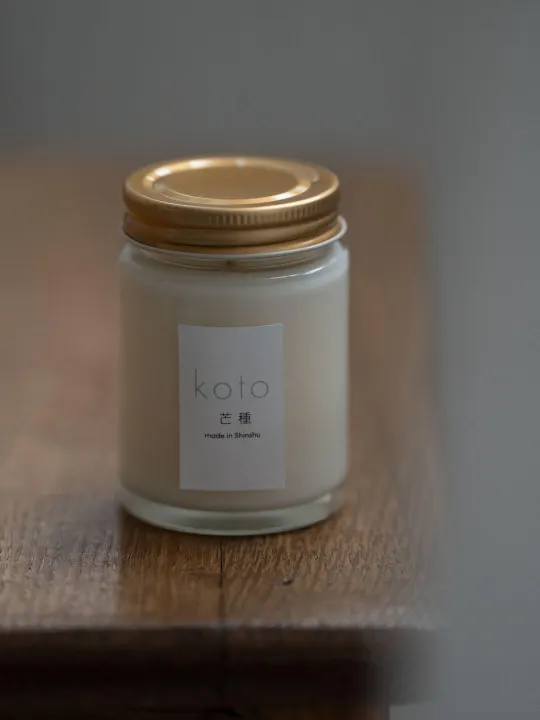 こちらのminiサイズはご自宅で手軽に灯していただけるよう、蓋付きの瓶入りの少し小さいサイズとなります。 kotoの自社アトリエで作る四季巡る二十四節気のキャンドルは、厳選した原材料を配合し、ブレンドや調合、箱詰めまで一点一点職人の手によって心を込めてしつらえています。 大豆とアブラヤシの天然ワックスを独自にブレンドし、香りの拡散と持続、燃焼効率に優れたハンドメイドキャンドルをお届けします。 稲や麦など、芒(のぎ)のある植物の種を蒔く頃――芒種。 かまきりや蛍が姿を見せ、梅の実が熟しはじめます。やがて梅雨の気配が漂い、しっとりとした空模様が訪れる季節でもあります。 「芒種の香り」は、洗練のなかに温もりと親しみを宿したフレグランス。上質さと柔らかさが絶妙に調和し、どこか懐かしくも心地よい豊かさを届けてくれます。 最初に立ちのぼるトップノートは、洋梨の軽やかで透明感あふれる香り。清らかに澄み渡り、初夏の爽やかな光を思わせます。 続くミドルノートでは、ジャスミンとネクタリンがやわらかく絡み合い、気品と甘やかさが調和します。そしてメインとなる完熟アプリコットが、太陽に育まれた果実のような甘さで全体をやさしく包み込みます。 やがてベースノートでは、ベチバーとパチュリの穏やかな深み、そしてバニラの温かな甘みが重なり、まるで自然に囲まれた静かな邸宅に身を置くような、控えめで上質なラグジュアリー感を演出します。 配合精油にはラバンディンが加わり、香り全体に清らかな余韻と安らぎを添えています。果実のやさしい甘さと大地の深い落ち着きが重なり合い、心に初夏の実りの予感と穏やかな安らぎをもたらしてくれる香りです。 二十四節気の移ろいに寄り添うように、kotoのキャンドルはすべて厳選された原材料を用い、自社工場で一点一点、手作業で仕立てています。ワックスの配合や芯の細部に至るまで丁寧にこだわり、美しく灯りと香りを楽しんでいただけるよう心を込めています。朝の始まりから夜のひとときまで、季節の気配を感じる香りが日常に溶け込み、暮らしのリズムにそっと寄り添ってくれます。