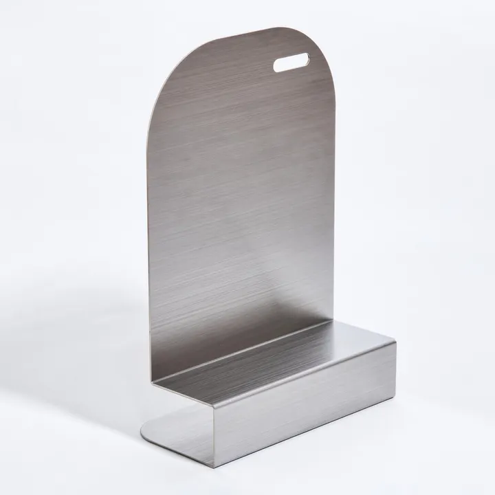 シンプルアートに、 美しく暮らす。 TETUTO ステンレス kitchen panel stand 2 ステンレス素材の 縦型キッチンパネル。 ミニマルデザインと 使いやすさに 1mm、1°以下まで こだわりました。 ///空間が息づく、鉄と暮らす。/// シンプルの中に、アートを感じるミニマルなデザイン。空間が息づく鉄と、美しい暮らしを。 ///「そこにある」だけで、美しい。/// 落ち着いた”くすみ”を放つ、 ヘアライン(無数の極細線)加工を 両面に施しました。キッチンを美しく彩ります。 ///とても、スリム。/// 奥行きは10cmで、 とてもスリムなので シンクを広く使えます。 シンク奥やコンロ横など 狭い場所にも設置して スペースを有効活用して頂けます。 ///強力な、くっつく力。/// 強磁性なステンレスを採用しました。 鉄と同じ、強磁性なので磁石本来のくっつく力を発揮できます。 強い磁力をそのままに活かした接着力で、お手持ちのマグネットツールを安定して取付できます。 ※ステンレス自体は磁力を持っておりません。 ///倒れにくいデザイン。/// パネルの重心を中心から少しずらすことで、パネルにマグネットツールをつけた時に安定する設計にしております。 そして、厚みが2.0mm、重さが1.6kgあるステンレスですので、ずっしりと安定します。 ///厚みのある、鉄を。/// 本物の鉄の良さを感じて頂けるように、厚鉄から削り出します。材料費は惜しみません。 TETUTOステンレスシリーズは、2mmや1.5mmから削り出します。 しっかりした強度や、ほどよい重みを感じる、「暮らしに馴染む厚み」にこだわります。 ///国際品質規格認証工場で熟練職人が作る。/// 表面は、無数の極細線仕上げで、上質な「くすみ」を放つ。 角は、手作業で削る。ほどよい重みと、手に馴染む丸み。 国際品質規格認証工場の、職人技で、 手間と時間を惜しまず、ひとつづつ作る、 made in Japan品質です。 いつまでも見ていたい、 触れていたい。 そんな鉄のある暮らしを。 心を込めて。