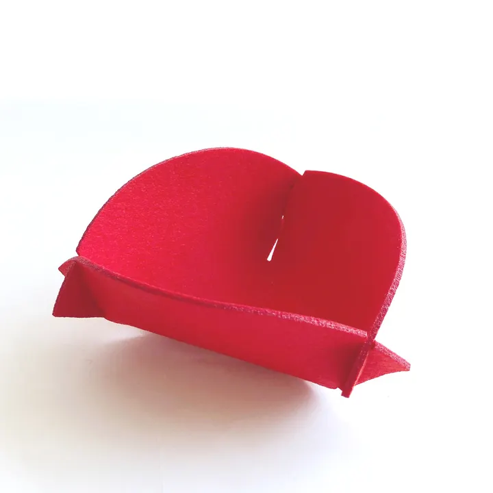 ふんわりとした〈小物入れ〉をデザインしました。3ヶ所の切り込みを差し込むだけで立体になる楽しいアイテムです。フェルトはモノにも人にも優しく、クリップ、ピン等の文具からアクセサリー、キャンディー等入れるもののアイデアが広がります。使い方はデスクトップ、テーブルウェア、リビングの小物入れとして、またお出かけに携帯すれば使用したいところで、大事なものの小物入れとして活躍しそうです。もちろんウォッシャブルフェルトを採用しており、汚れた時は洗濯可能です。ビビットなカラーはプレゼントにもおすすめです。