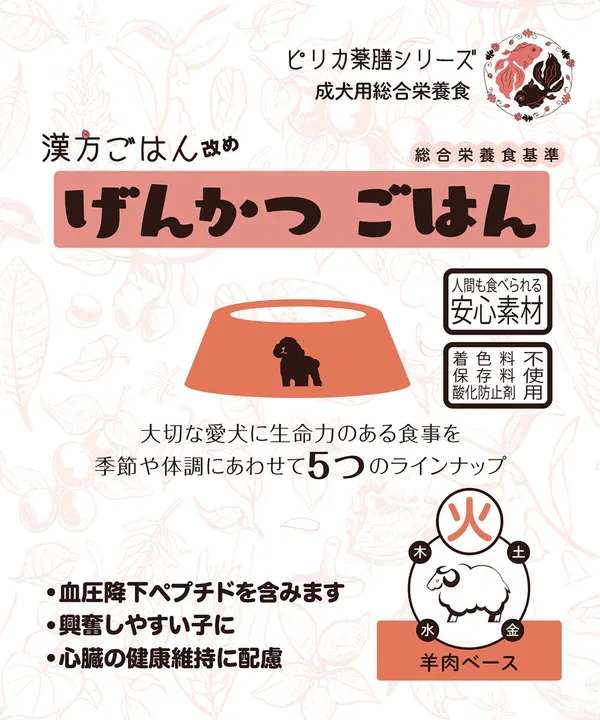 羊肉、豚ハツ、きび、押麦、小豆粉、豚レバー、にんじん、じゃがいも、きゅうり、マッシュルーム、えごま油、ビール酵母、れんこん、なつめ、オリゴ糖、卵殻カルシウム、大豆レシチン、こんにゃく粉、粉末昆布、シナモン、ミネラル(P、Zu、Se、Mu、Cu)、ビタミン(E、D)、水